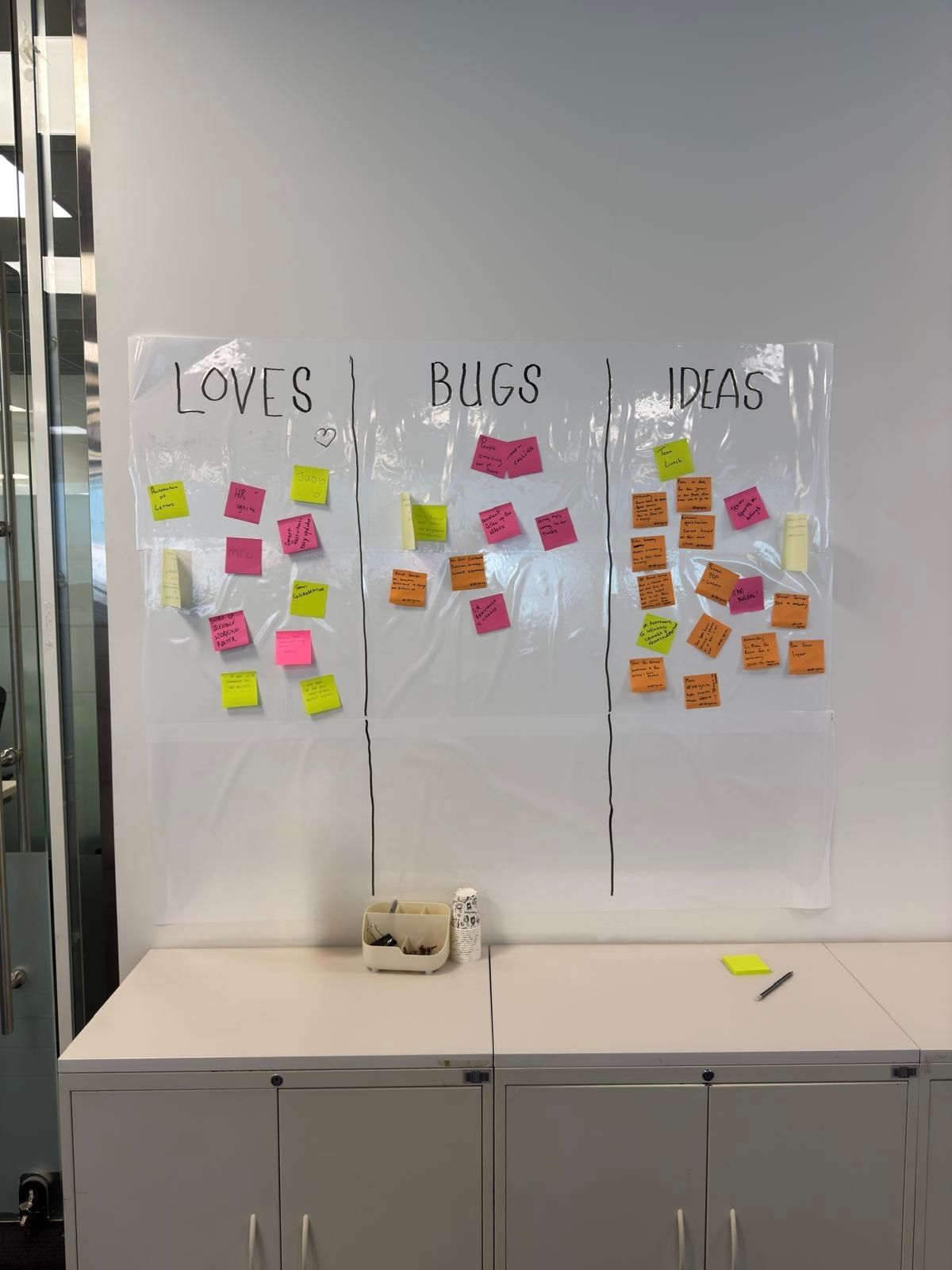 Love/Bugs/Idea: one of my roles in dubai is driving change in the HR team from how we talk, think, operate, build and ship people product moving a traditional HR function into a people product one is a big lift but It doesnt have to be done alone. Recently I put up a loves bugs and ideas board up on the HR with minimum direction the board start to fill up with what they love (this gives me a steer on what to crank up) Bugs (this give me a steer on what to blockers to smash through) ideas (This gives me buckets of stimulus and idea I may never have come up with)